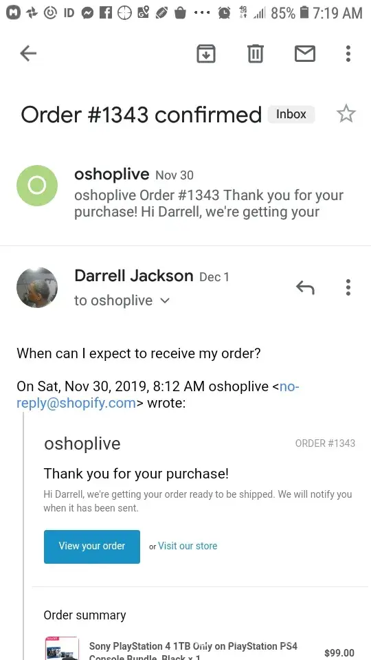 I put it in order for PlayStation 4 have not received it yet have not received any information on it yet a tracking number or anything I have been sending emails and have not had any responses back at all my order number is 1343 and I placed the order on November 30th I would like to hear something back from someone about my purchase I would like to hear something back from someone about my money if they can send me my money back because this hard times right now and I cannot afford to be losing out on a hundred bucks so please contact me about my purchase order so we can resolve the situation without having to do things legally