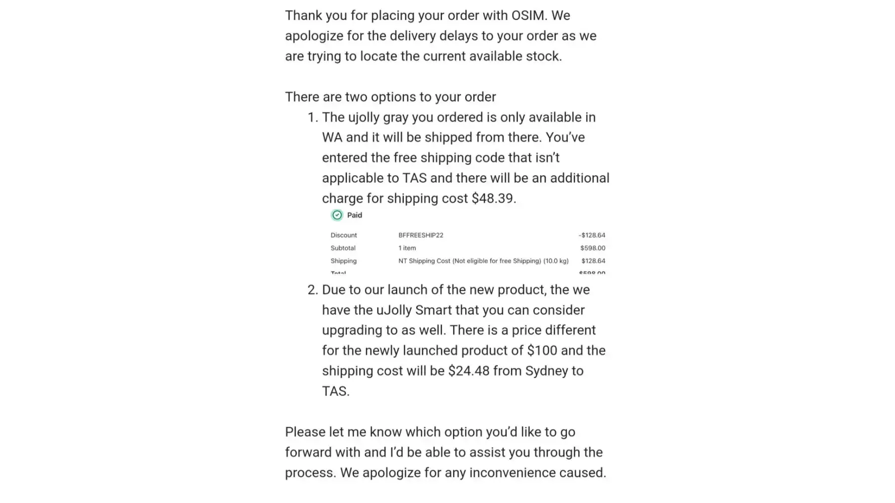 I bought a ujolly massager in early November 2022. After receiving no delivery details or further correspondence, I reached out in December, 6 weeks later, expecting my item to be almost here, only to be told that it was never shipped because they didn't have it in stock. Why sell something that you can't deliver? Was then given the option to pay extra to...