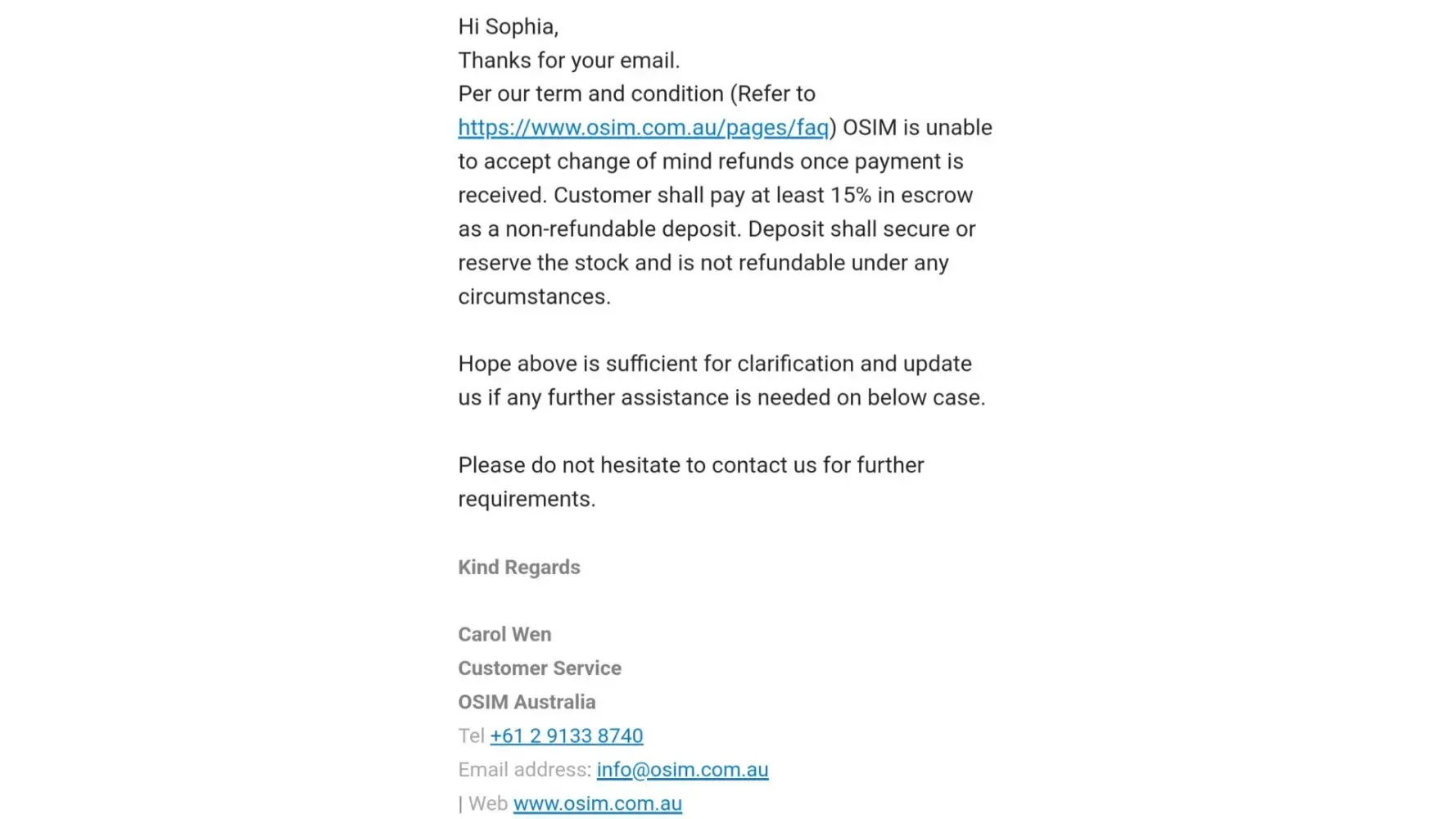 In conclusion, my experience at OSIM was less than satisfactory, and I hope that the company takes steps to improve the training and attitudes of its staff towards their customers. It is my belief that quality customer service is key, and that investing in it will pay dividends in the long run.