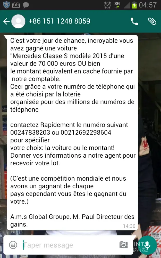 sir my name is krishnan i got a message to my mobile that i have won [protected]$ on1472011.to recive the price money contact Dr.alex on e-mail otdc55@live .com