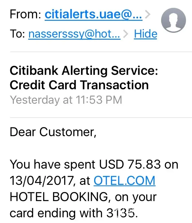 I received a credit card transaction confirmation from the bank stating that we have spent USD 75.83 on 13/04/2017 at OTEL.COM.