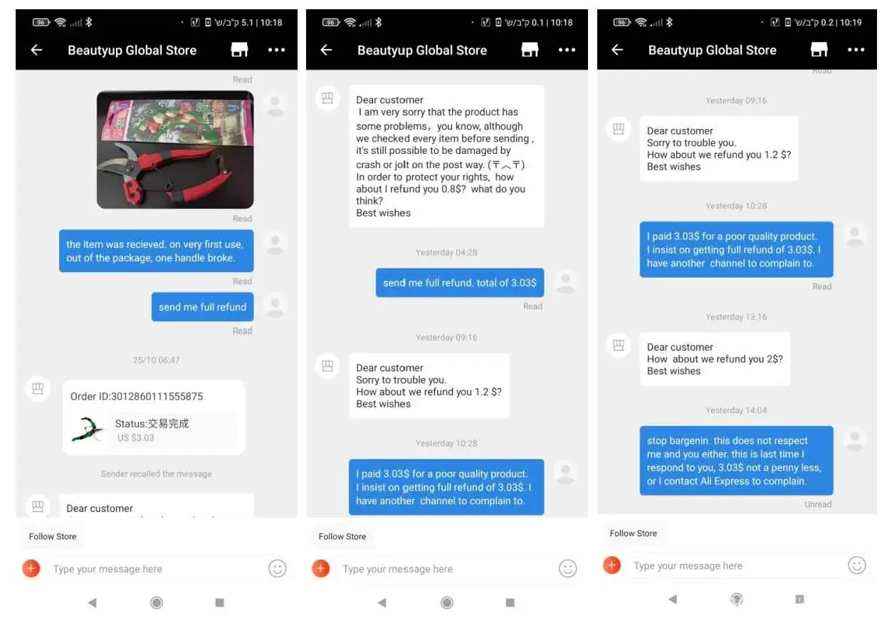 Order number 3012860111555875 The item recieved broke on first use. Seller refuses to refund full amont paid. They started at 0.8$ which I refued, then they offered 1.2$ which I refued as well. Thier last offer was 2$ which I refued as well. I told them to stop bargening and that I am going to complain, and so I did. I insist on getting full refund of 3.03$.