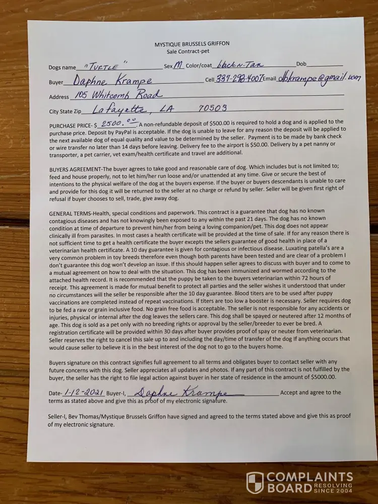 Hi, My name is Daphne Krampe. Please help me rectify this issue. I purchased 2 puppies from Bev Thomas with Mystique Brussels Griffon on Jan 29, 2021. I signed a purchase agreement on Jan 12, 2021. Her cell number is (660) 537-3177 and her email address is [protected]@yahoon.com. The puppies were born on November 16, 2020. I purchased 2 black and tan...