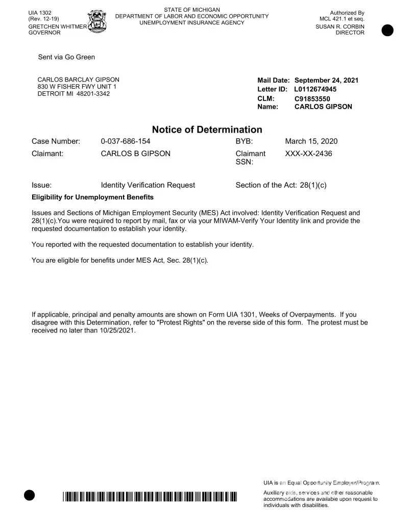 Carlos Gipson CLM # C91853550 Since the initial filing of my claim for unemployment benefits, I've been met with conflicting correspondence, nonpayment of approved benefits, and continual misinformation from associates of the agency. I've experienced what seemed to be suspicious behavior around my MIWAN account, in that information was changed then changed...