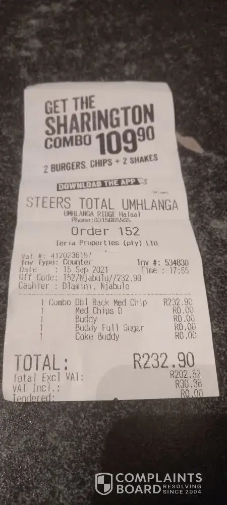 Today 15/09/2021 at 17H55 I ordered (order 152) combo dbl rack & med chips (R232.90) at Steers Toatal Umhlanga as takeaway. Cashier who also dispatched my order was Dlamini Njabulo, invoice 534830. When I arrived home I was shocked to see that I was given a Wacky Wednessday. I subsequently called their number [protected]. Was referred to the manager Amith...