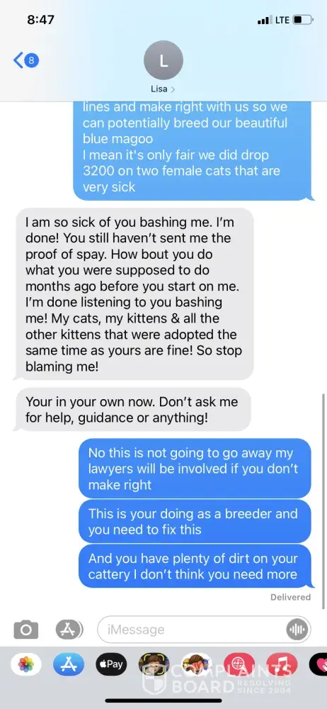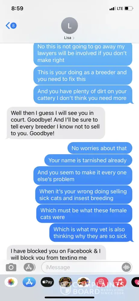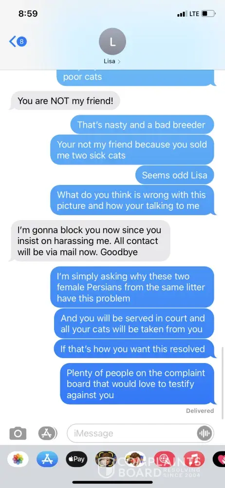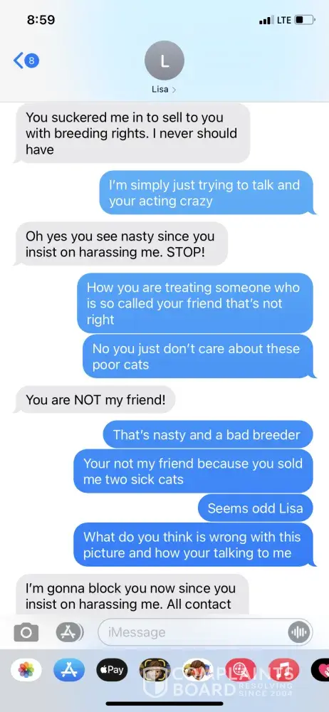 I want to start by saying how unprofessional this breeder is she sells sick cats it has been a nightmare I had purchased 2 female kittens from the same litter that had been sick for the past 4 months with explosive diarrhea my vet thinks they are inbred and they have very weak immune systems every time I try and talk to this lady Lisa dymond she says I'm...