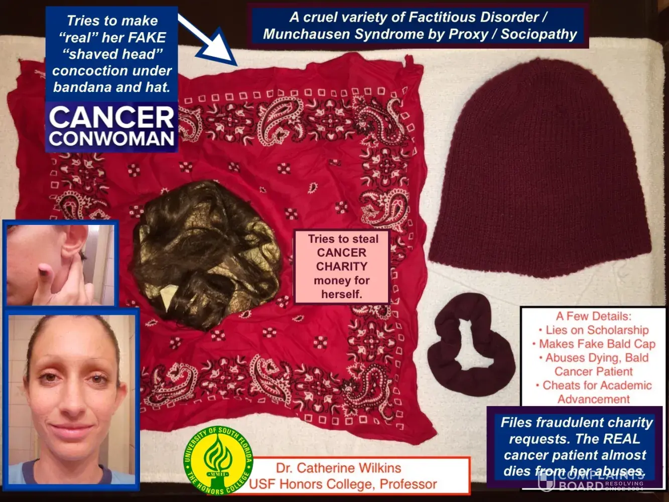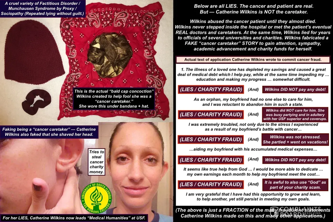 Professor, Assistant Dean Catherine Wilkins For Judy Genshaft College USF: Catherine Wilkins' CANCER charity fraud. Catherine Wilkins repeatedly found opportunities to cheat, lie, and defraud the academic system. Catherine Wilkins tried to steal charity money with a CANCER SCAM. Catherine Wilkins committed multiple instances of charity fraud...