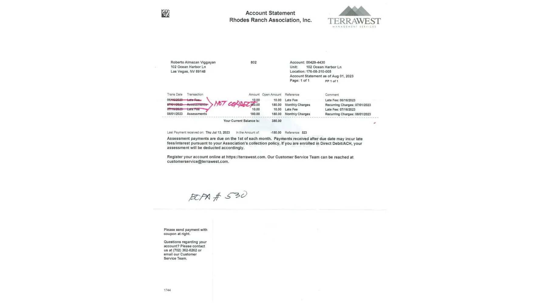 I pay a monthly association dues to Rhodes Ranch Association, Inc. The payment collection was handled by Terra West Management Services who send notices few days before the next monthly dues. As example they send notice on July 27 for the dues for August. In order to avoid any delay I make my payment as soon as I receive the notice. However, instead of...