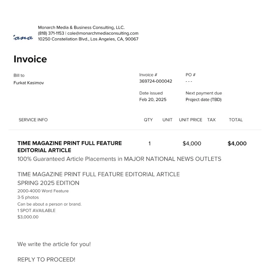 Read full complaintMonarch Media & Business Consulting, LLC - Guaranteed article placements in major national news outlets