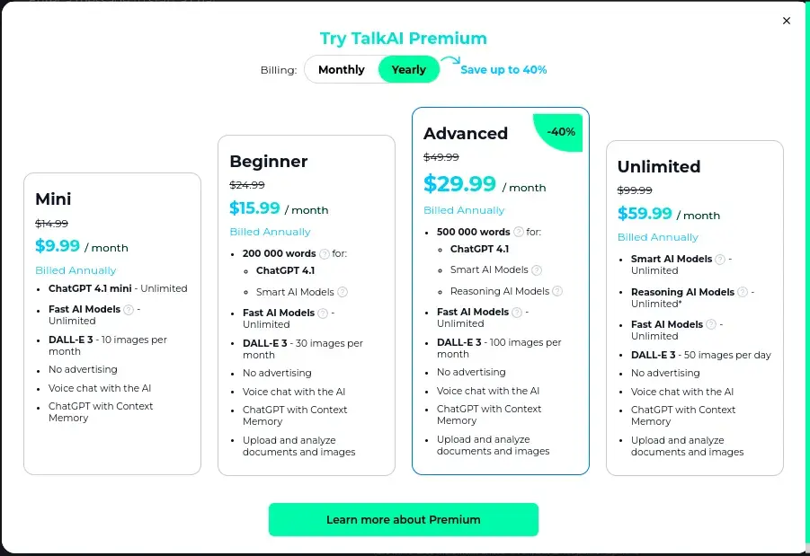 In early 2024 or mid 2024, the company TalkAI added a pop-up message saying "Try TalkAI Premium" in the website https://talkai.info and it would appear when talking to the chatbot and it's annoying right now because I did request them to remove that but they declined it and says they cannot assist. However, they increased the amount of times it would appear...