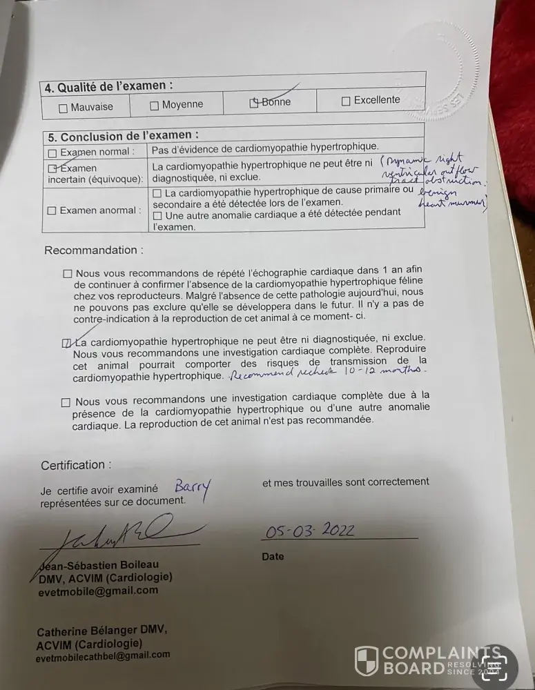 I purchased a kitten for breeding. He came with ring worm, Giardiasis and a heart murmur. At a year we checked his heart via scan and found he was equivocal. We followed up that scan with a board certified cardiologist. She wanted another scan done so we rescanned a third time at the 6 month mark and he now has HCM. We told her and she is ignoring our...