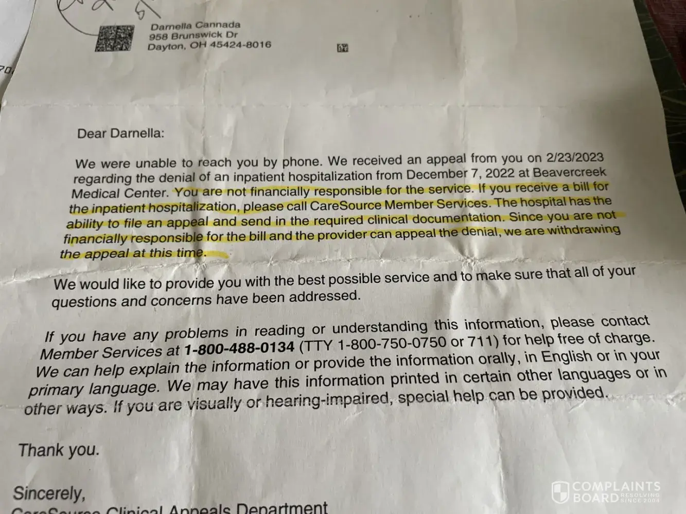 This is darnella c. And I have a letter that states that I am not responsible for This bill.from CareSource March 7 2023.so I really sick and had Candidus all through my body so when I went to the hospital for four days, my blood pressure was sky high and I was infected from my mouth cleared down through my stomach, and when they decided to go down in my...