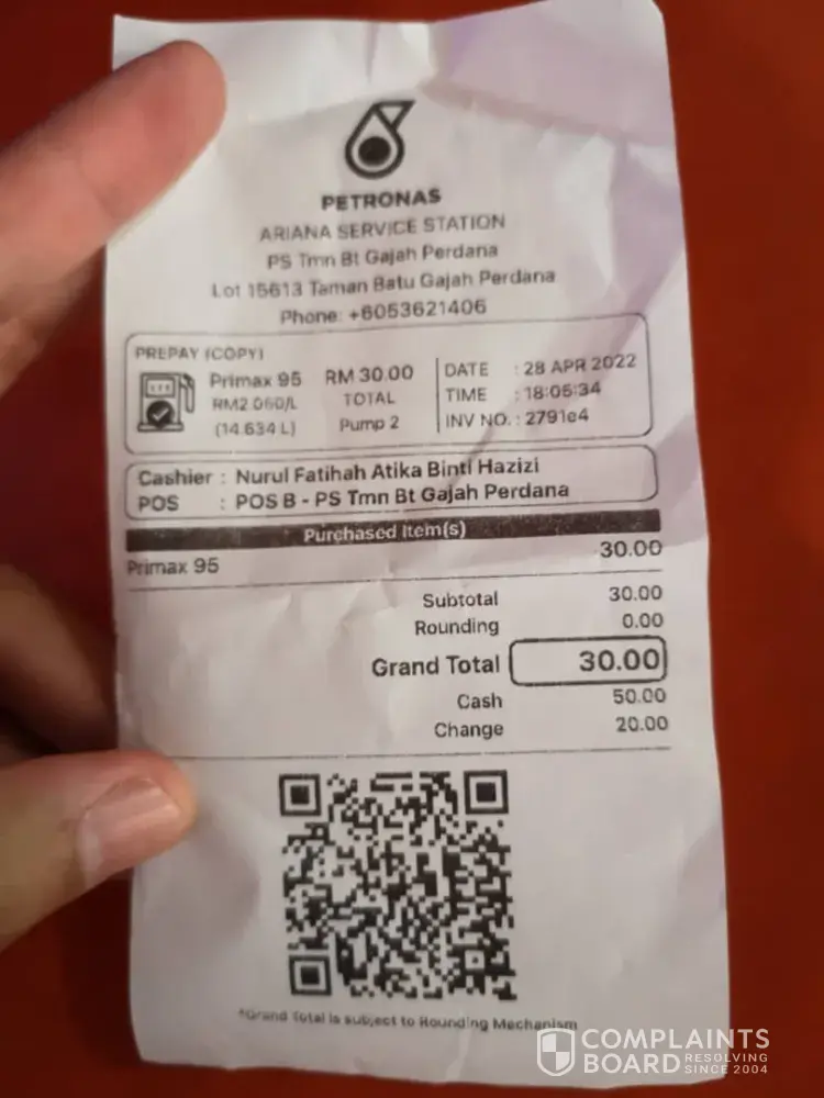 Pada 28/4/2022 jam 18:06:34, saya telah datang untuk mengisi minyak di stesen tersebut. Pembayaran telah dibuat sebanyak rm30. Setelah pembayaran dibuat, proses isian minyak tidak dapat dilakukan kerana sistem bermasalah akibat kilat yang kuat. Kami telah diminta untuk menunggu sebentar sementara staff menyelesaikan masalah tersebut. Setelah menunggu...