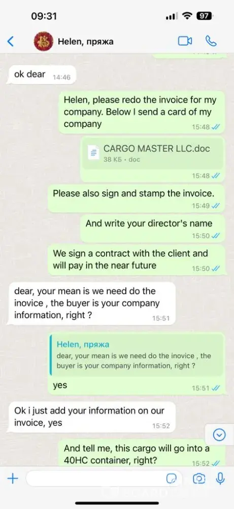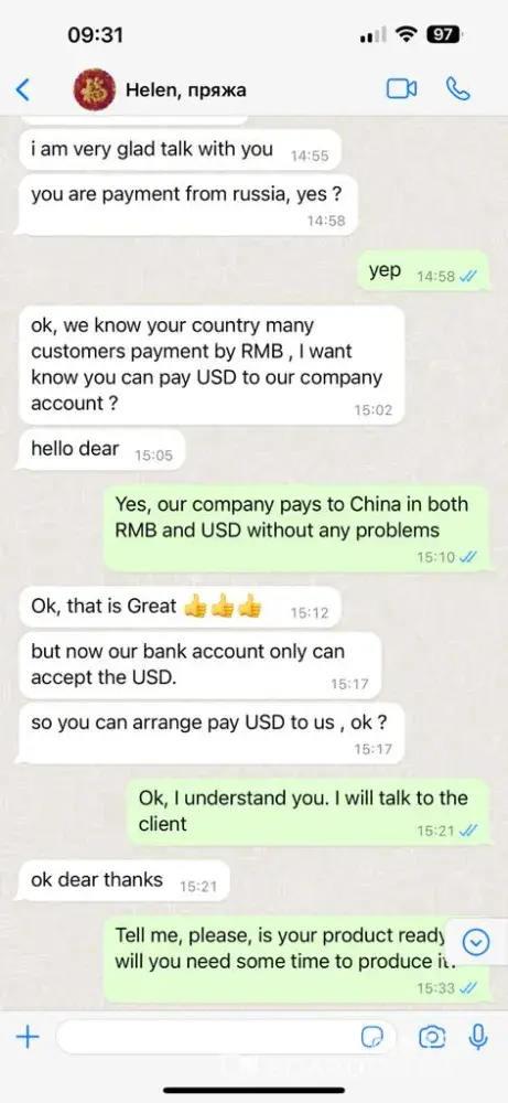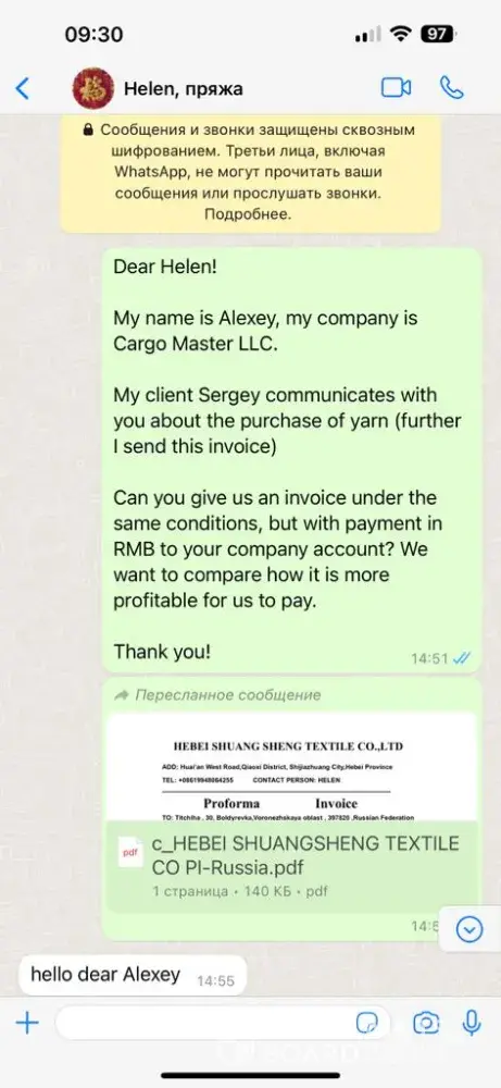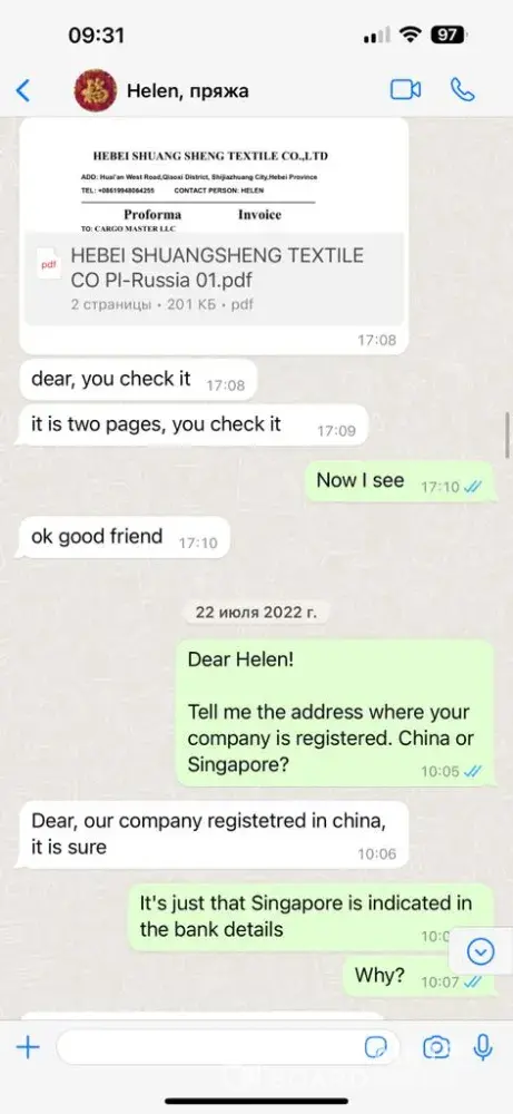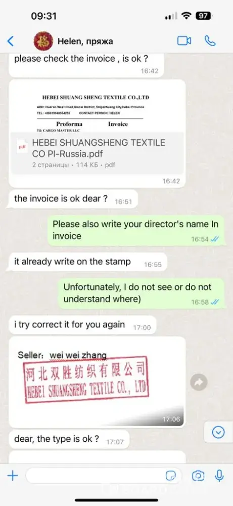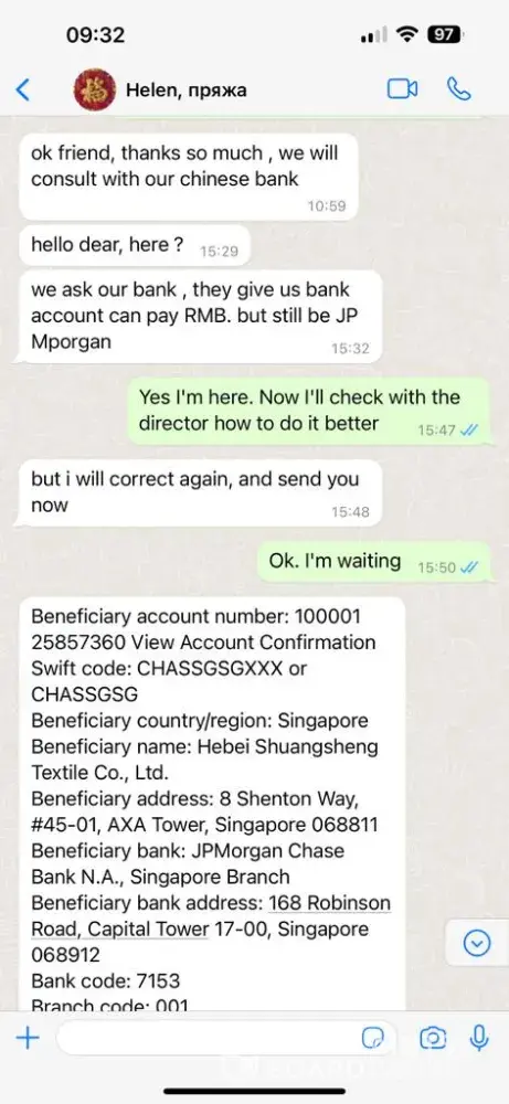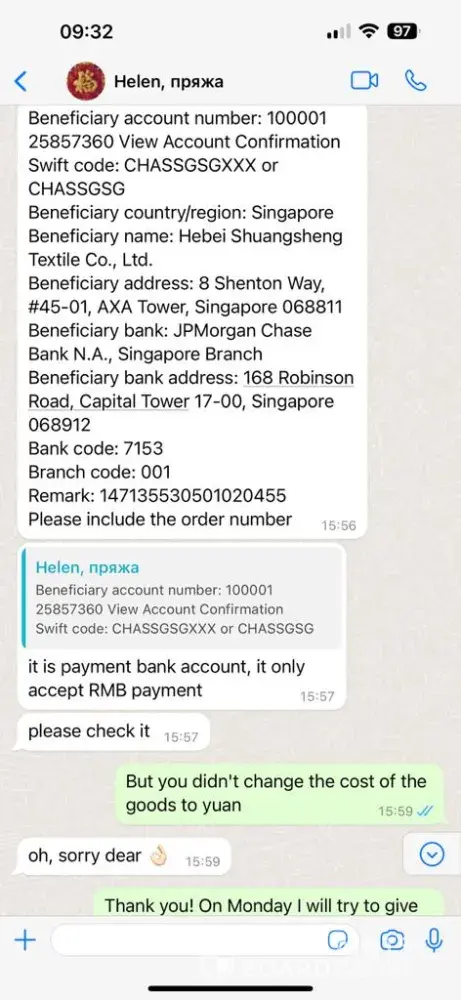 A scammer is trading on your site. a year ago, it was this person who negotiated with us on behalf of another company and stole money from us. On July 19, 2022, an international contract was concluded for the supply of goods - recycled yarn with Hebei Shuangsheng Textile Co., Ltd, whose director is Wei Wei Zhang, in the amount of RMB 246,291 On July 28...