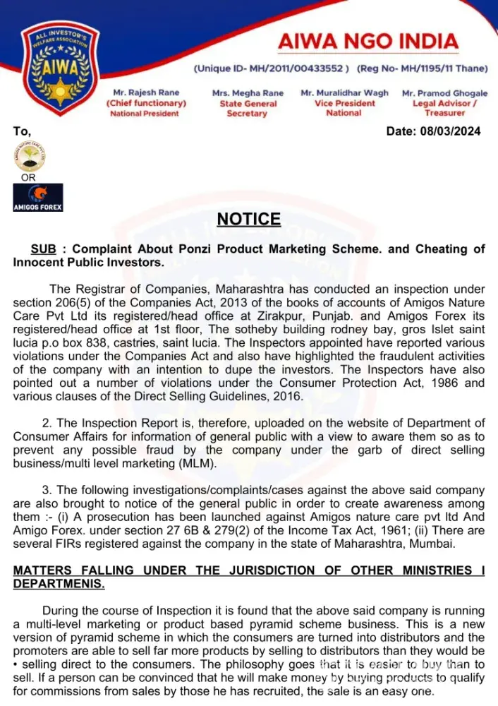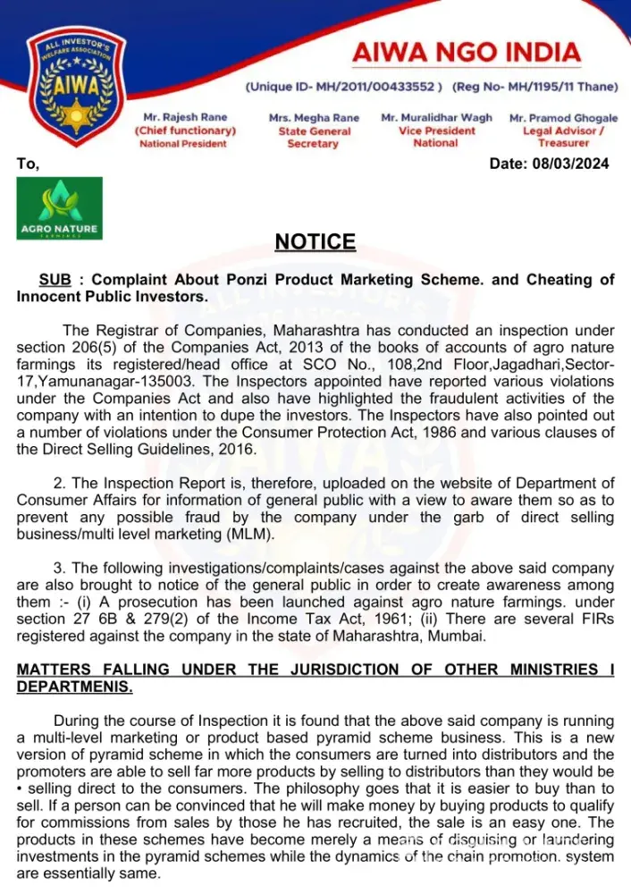 Read full complaintAiwa Ngo India - Complaint about ponzi marketing scheme agro nature farming cheating of innocent public.