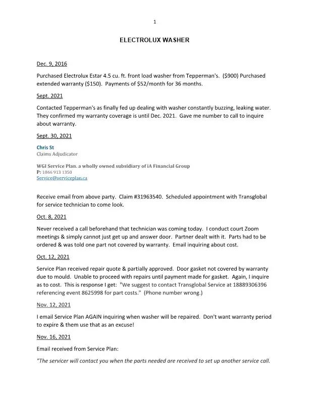 Read full complaintTeppermans and WGI Service Plan, subsidiary of iA Financial Group - Warranty