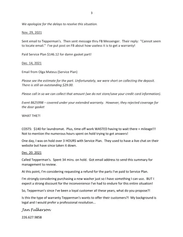 Claim #31963540 See attached summary of the ridiculous runaround I received in trying to get warranty work completed on my washing machine (purchased from Teppermans in 2016) - for over 3 MONTHS! So fed up in having to leave house and go to laundromat, I ended up having to purchase a NEW machine. Total b*s!! Even the repairman that came to house couldn't...