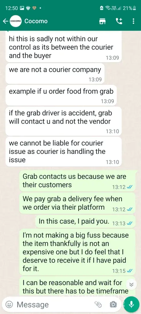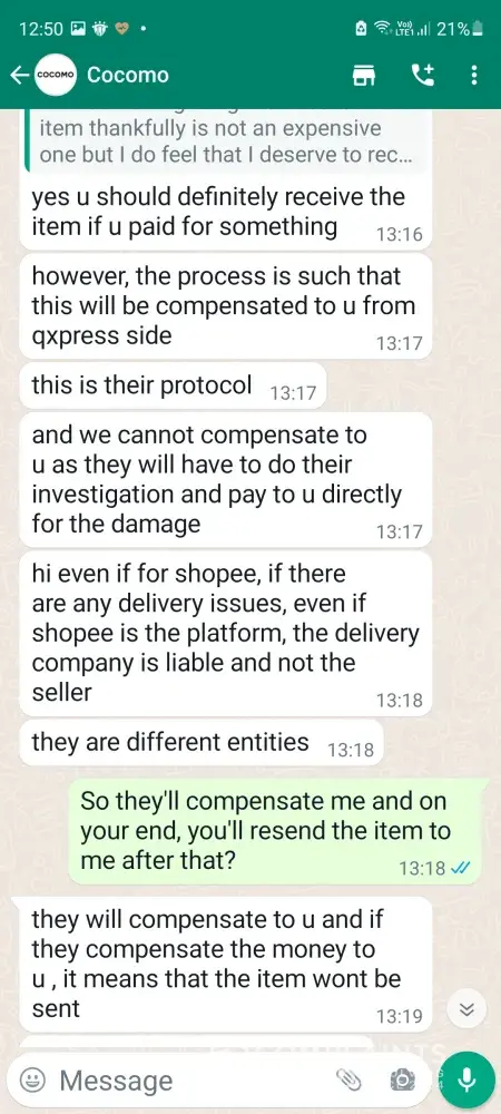 Read full complaintCocomo SG - Refused to take responsibility for damaged item