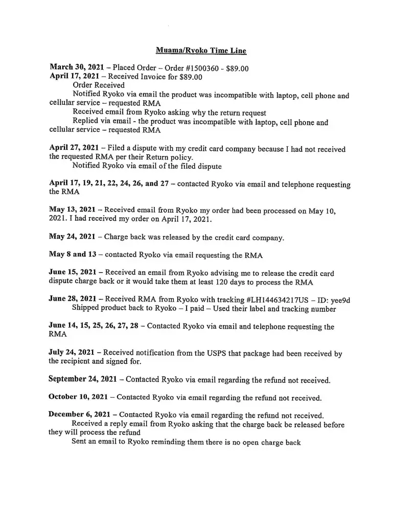 Between April 17 and June 28 it took 26 emails to receive the RMA. The product was returned per their label and instructions on June 28 at my expense. The USPS advised they had delivered the package on July 24 and had a signed receipt by a Ryoko employee. Since July 24 there has been 16 emails and still no refund. Fernando Rey Punta, among others have...
