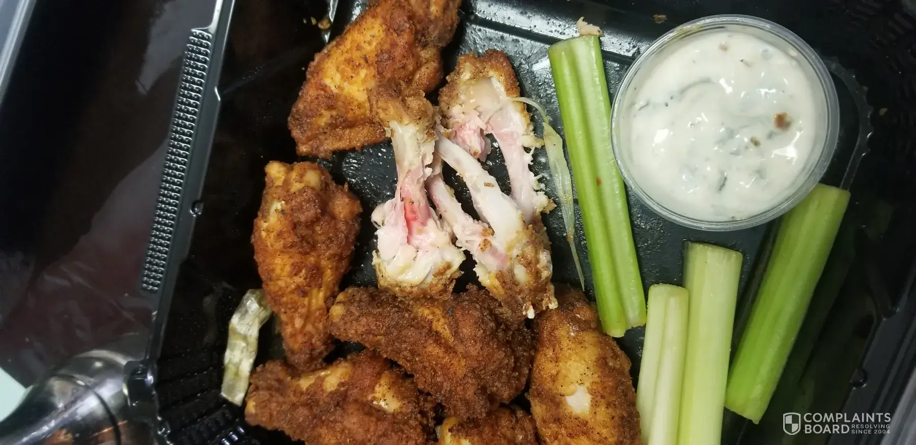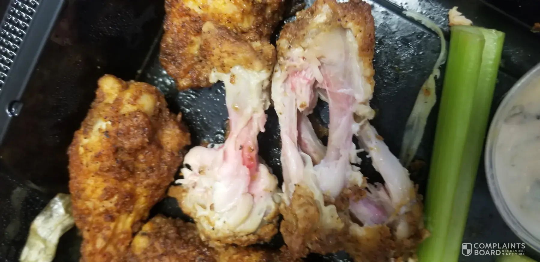To whom it may concern, I was so happy to be able to get food delivered from you guys today. It came in a timely manner. But I was really disappointed with the wings and they were not cooked properly. As you can see in the pictures attached that they were still pink and even red on the inside meaning they were not cook thoroughly. I usually enjoy your...