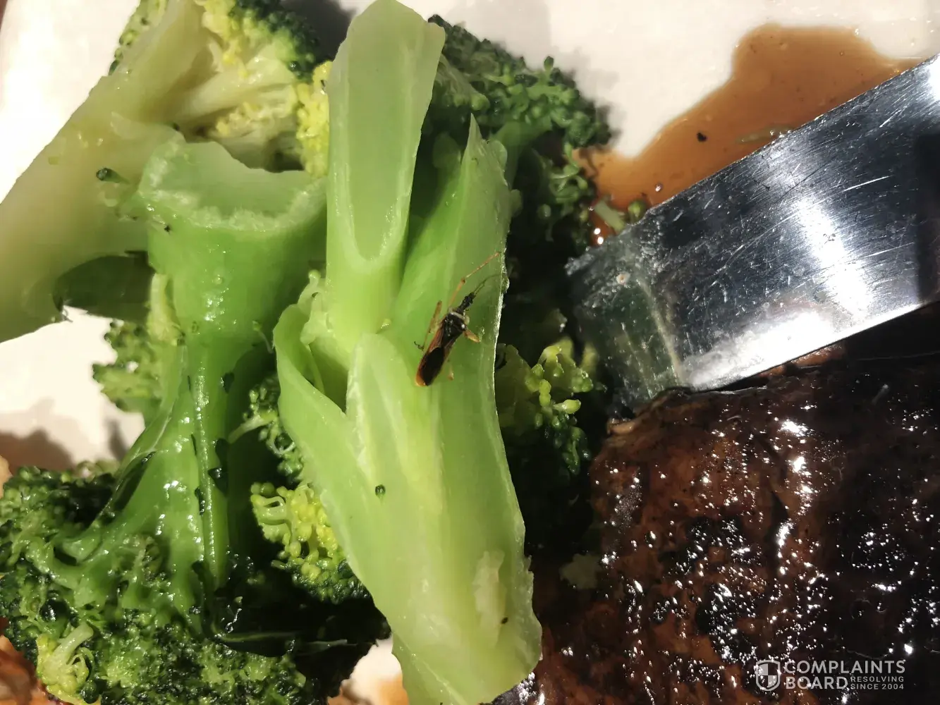 I immediately put my fork and knife down, asked my husband to grab the manager, and proceeded to show this to her, making sure I don't make a fuss for the other patrons. She came over, looked right st it and said, "I don't see anything." I don't know if it was a refusal to accept the roach or what. So I point it out to her and she said "Oh. What is that?" I said "It's not broccoli nor is it steak. It's a bug." She just took the plate l, gave me a short apology, and walked off. My family and I got up and left.