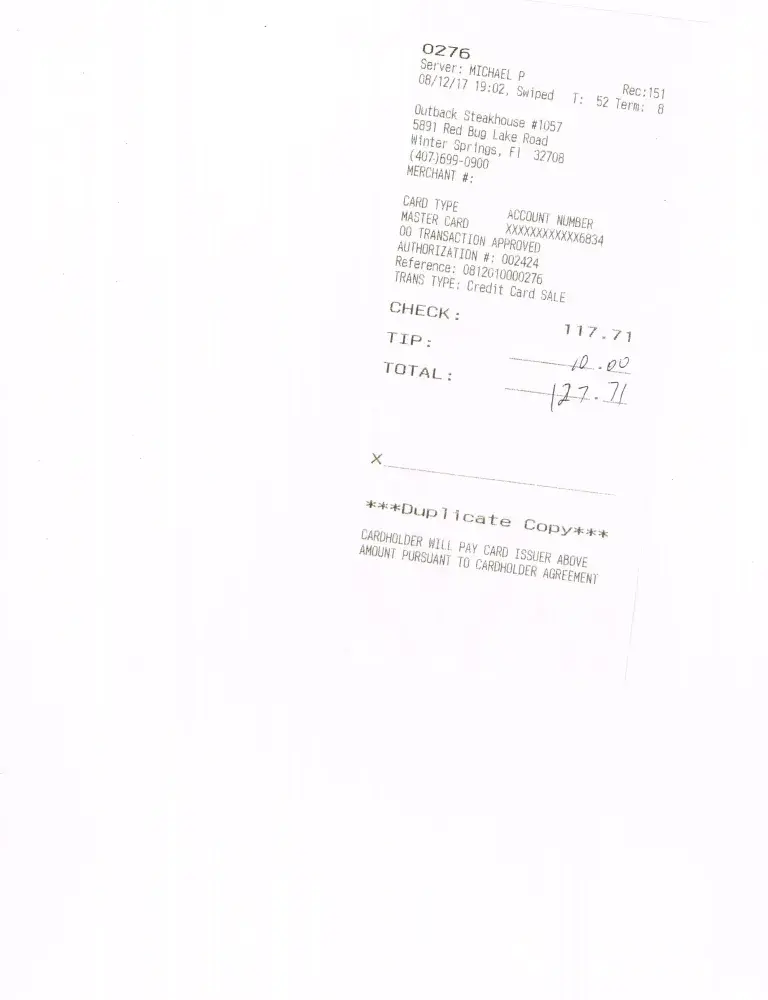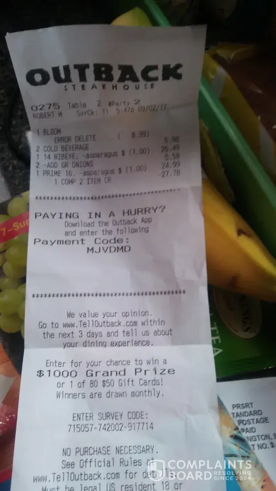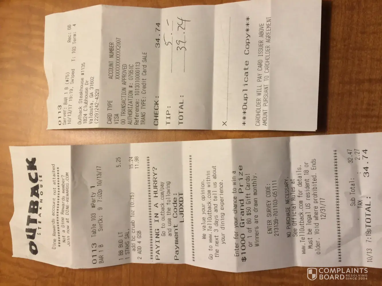 My ticket # was 0108-1; server was Victoria P, timeframe was 8/27/17 at 18:07 - this was the Outback in Crystal Lake, IL.