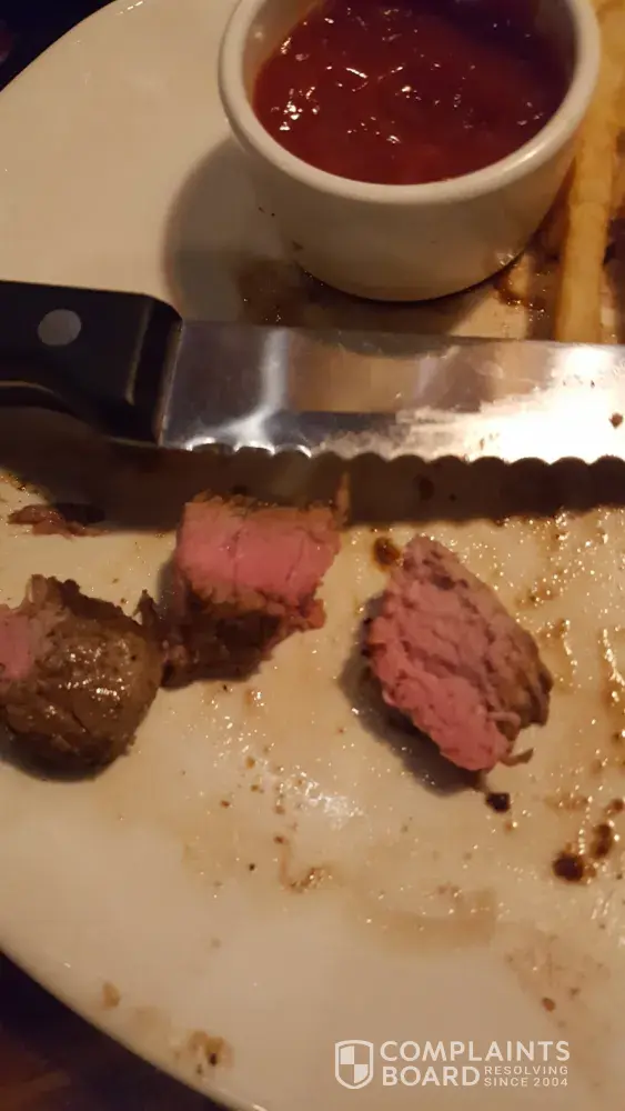 I did cut into my steak & took a bite, but the texture of the meat was not of a filet. I told my waitress & she informed her manager. The manager came back out less than 5 min. after she said she would make me a new steak & presented me with another piece of meat.