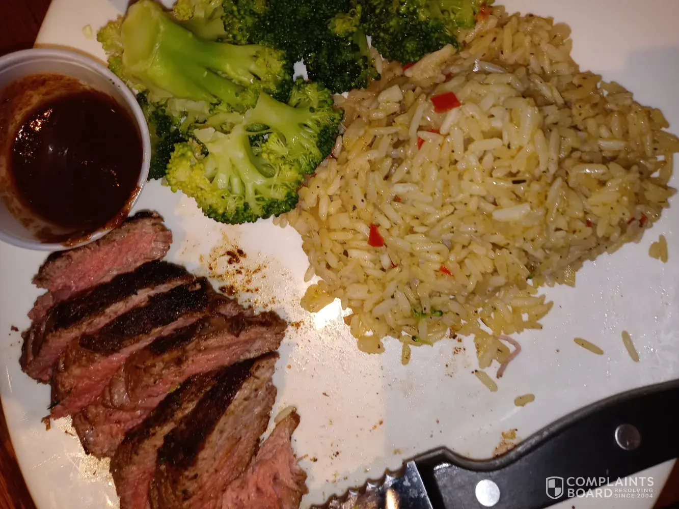 We enter the resteraurant at 7:30 pm we were placed in a booth at 7:45 pm my husband ordered a medium well steak with broccolic with mash potatoes his plate came out fine, my order was 6 oz sirloin with shrimp baked potatoe and a garden salad. The plate that was brought to me as a filet mignon steak with rice and broccolic/carrots and squash. I told this is not my food I am missing a baked potatoe my shrimp. So she brought me the bake potatoe and shrimp that were dried out and the bread underneath was hard as a rock. I requested a manager and I showed him my meal and he was shocked at my plate and the two steaks that were still raw instead of medium well. He claimed he was going to fix the order by this time my husband was done eating and I and still waiting for the manager to fix my food that I never got. The cooks and the waitress should know to bring out food that is old and to not only check the dates on food but to check the food for spoilage. Sorry I forgot to get a picture of the other steak.