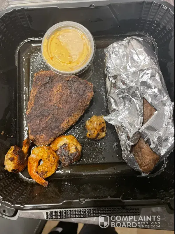 No taste on my husbands flat/looked pan seared steak; what happen to on the grill, he didn't even have grill marks on his steak. NO TASTE at all. And I ordered Sydney shrooms; I received a bucket of sautéed mushrooms not even close, not toppings for our baked potatoes; very pitiful. And all of this for the lovely take out price of $76.04 to get home and...