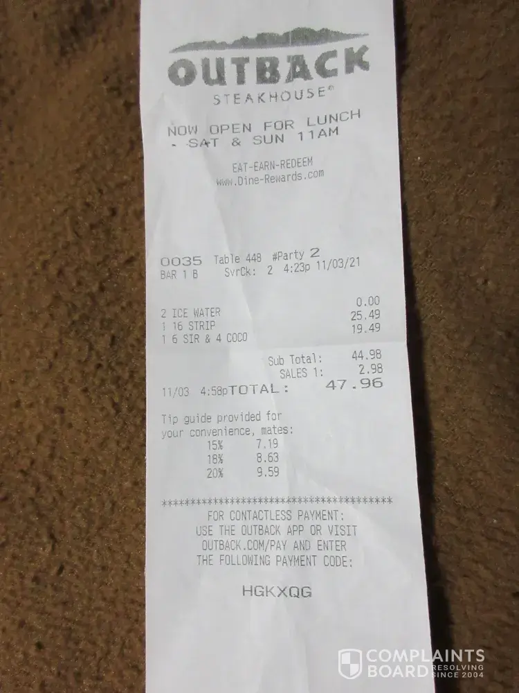 reply to [protected]@aol.com attached is the receipt for my husbands meal this service has left a bad memory of the Outback a place I used to love,
