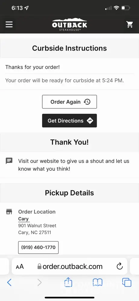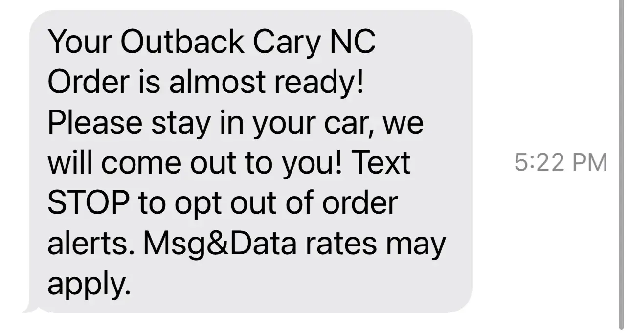 Today my family placed a curbside order from the Outback in Cary NC. Our order was supposed to be done around 5:24. I noticed how busy it was when I went to pick up the order. I received a text at 5:22 to say my order was almost ready. I would not have been upset waiting 5, 10 or even 15 minutes. However, 30 minutes is ridiculous. Our order was finally...