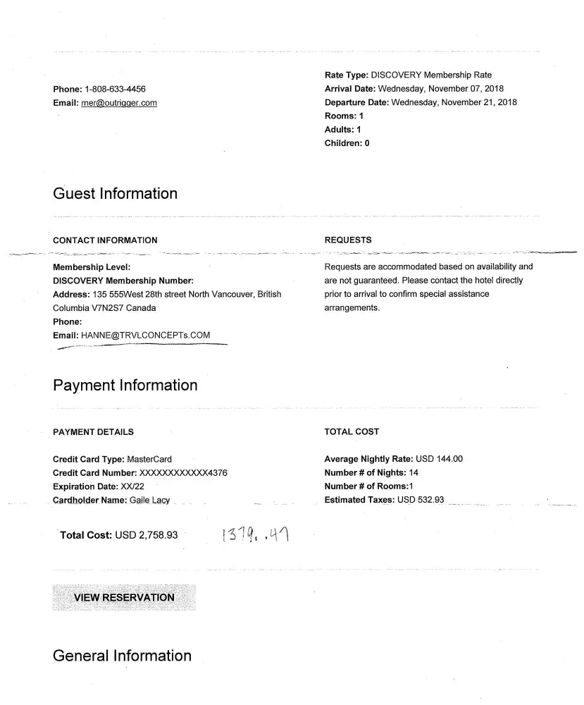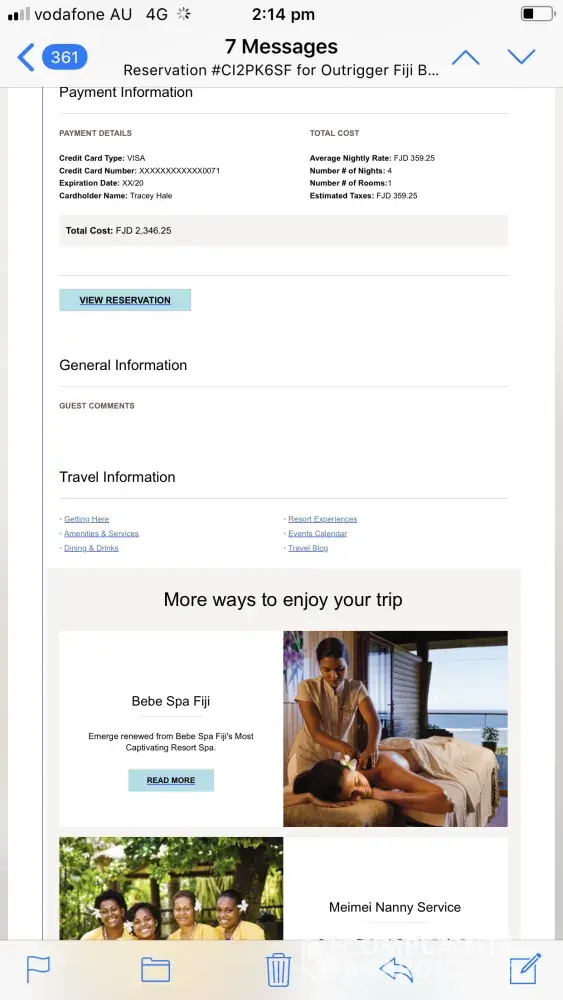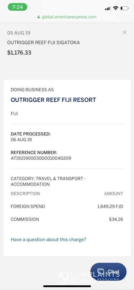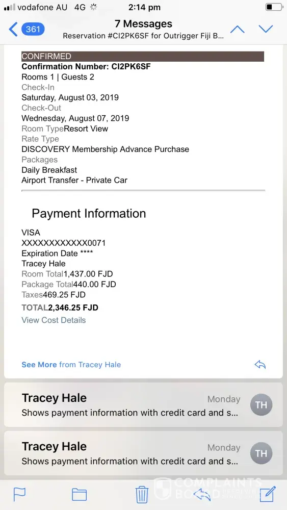We traveled to Fiji on the 3rd August to the Outrigger on the Coral Coast for a wedding. Last October we purchased a member advanced purchase rate accommodation. We received paperwork from the Outrigger stating that the full amount for the accommodation would be deducted from our credit card within 24hrs of making the booking. We turned up on the night of the 3rd to be told only 1 night had been taken and the other 3 were outstanding of over $1000. We had gone with $400 cash for food, no other means or access to any funds. Distressed we contacted our agent who too thought they'd taken full payment when she given our card details. We spoke to the duty manager who's response was purely ‘we changed our policy and only took 1 night' I argued as there paperwork stated differently leaving us stranded without funds to pay it. We had to call a friend in Australia to put it on her credit card. With such a big reputable company I don't expect such unprofessional practice, it was distressing and not acceptable.