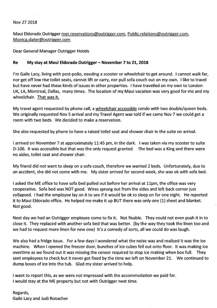 I wish to be reimbursed for this 2 week vacation as it was not an acceptable stay for the money we paid. I paid for this on my BMO US card. Part paid by my sister on her Visa.