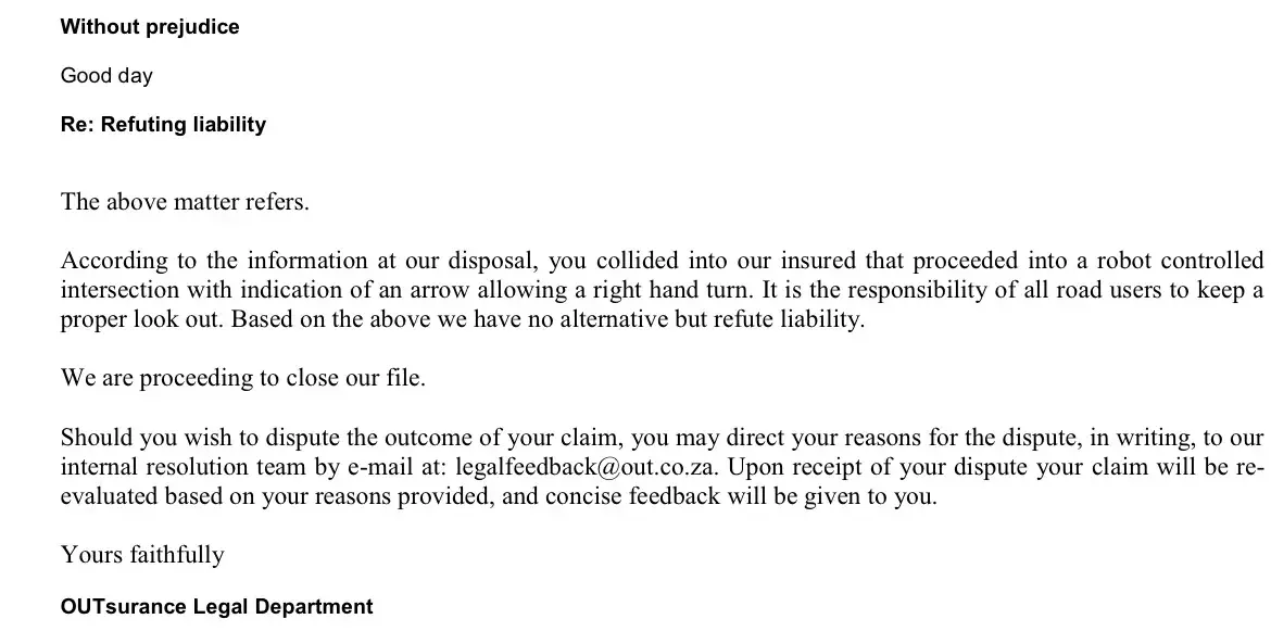 Disgusting and appalling behaviour from Outsurance.Their client was speeding because he didn’t want to miss a flight and turned right at a robot operated intersection without taking note of my car which was already in the intersection going straight.There was only one independent witness who was behind their negligent driver and he gave his details to the police.I made a third party claim against their client and they rejected it saying they will only take the information given by the people in their client’s car and won’t consider the independent witness who saw everything.