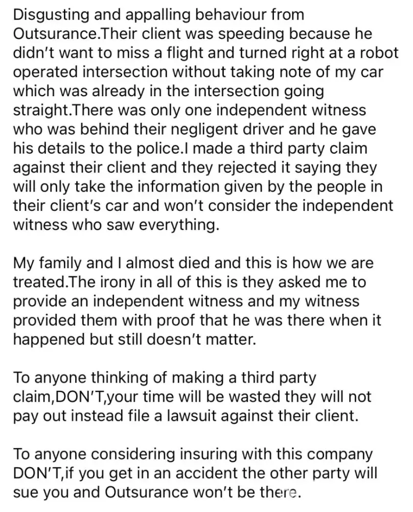 - We conducted a search on social media and found several negative reviews related to OUTsurance. These reviews may indicate issues with the company's products, services, or customer support. It is important to thoroughly research the company and its offerings before making any purchases to avoid any potential risks.