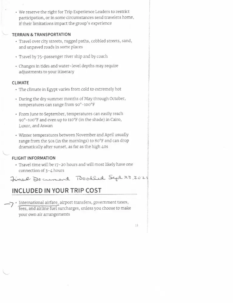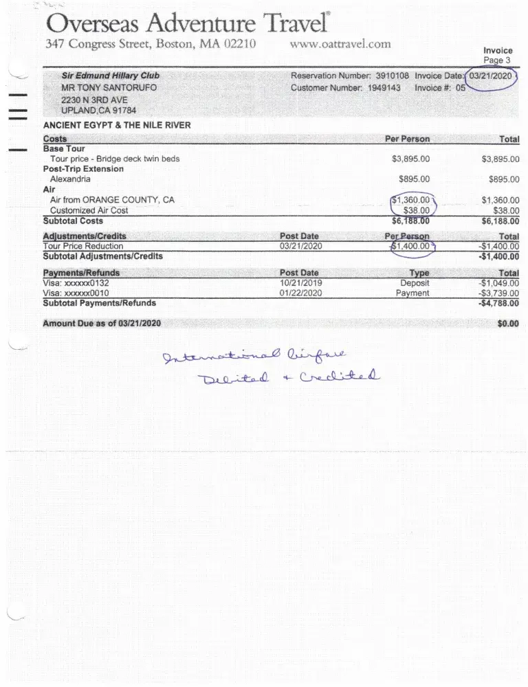 A trip to Egypt was originally scheduled for 04/20 but cancelled due to the pandemic. International airfare was included in the cost. The original reservation was #3910108 and changed to 3975236 when I rescheduled. I received a letter dated March 21, 2020 from the CEO, Harriet Lewis stating that I could get a full refund, reschedule for later 2020 or in...