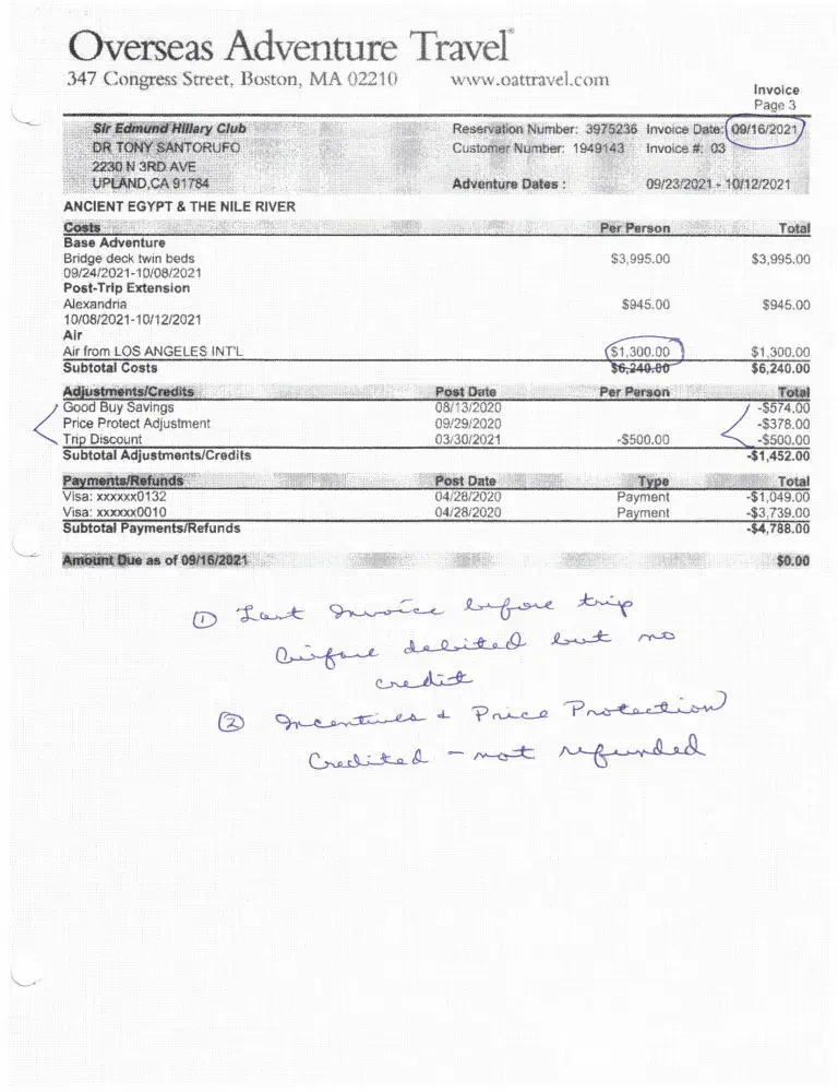 Desired outcome: A refund check for $4,934. That is $7,340 (paid to OAT on 4/12/22) minus $2,416 (due for Oct.1 trip per invoice #07 4/24/22) for a total refund of $4,4934.