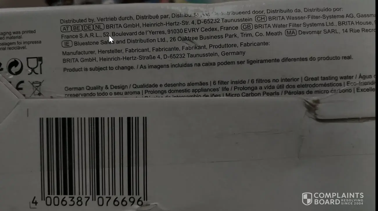 I ordered Brita Jug with 6 water filters. The original packaging claims that the filters are made in Germany. However, upon opening the box, I discovered that the filters had printed packaging stating that they were produced in the UK. This makes it false advertising which is illegal.