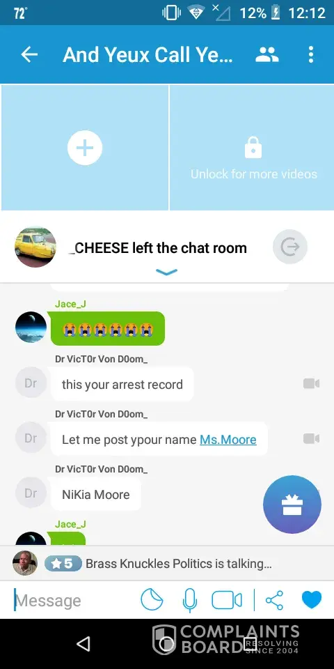 THIS ROOM IS POWER TRIPING WE COMES ONLINE FOR FUN CHAT AND MUSIC BUT TODAY ONE RED ADMIN BOUNCED ME WHILE I WAS ON MIC PLAYING MY MUSIC ON MY TURN SUDDEN AND BOUNCED, DONT KNOW WT HAPPEND WHILE SOME ADMINS INCLUDING Diddle dram dale, is mess few others like clickclickboom_1 few others i can name but not yet but how today red admin bounced me his nic is Doug PGN(Pal-editor) this person bounced we dont know why we are paying so much for colour virtual gifts i paid many 100 dollars here not for this insult can u help me to where i complaint this