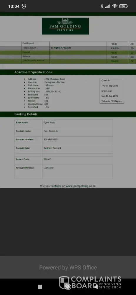 My name is Kagiso Malele on the 11 August 2021 my sister and I booked an accomodation for a long weekend of September in Durban Musgrave 284 Marmar unit number M11. A guy named Charles send us a Pam Golding form to fill in. We initially booked via Airbnb but he responded saying the placed was fully booked but has a secondary venue which we didn't suspect would be a scam. My concern is this guy has access to your company and putting your business's name in disrepute. Please assist by getting our refund back or atleast make sure this guy is barred from using your company to defraud unsuspecting customers. We were convinced all was well when we saw your company name, but later saw Tyme bank and got worried but it was already too late.