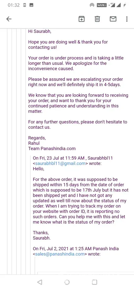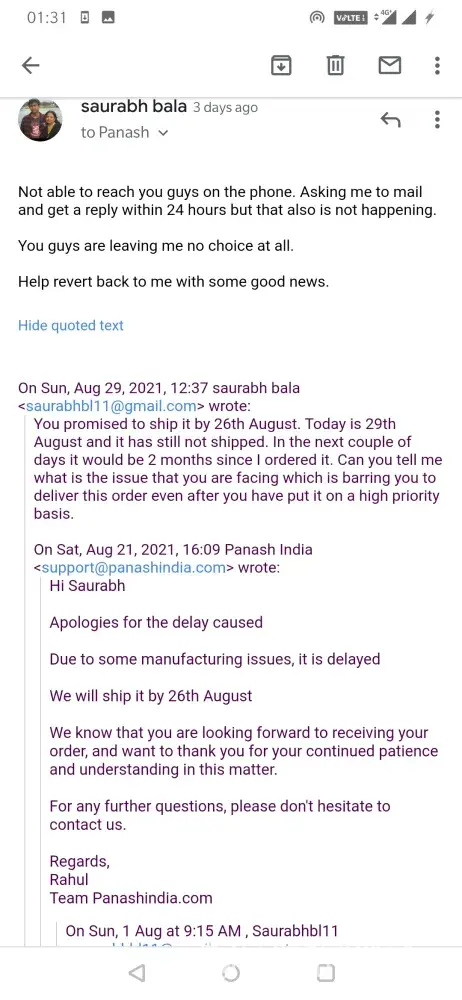 I placed an order on Panash (panashindia.com) more than 2 months ago and I still haven't received my product. They keep saying that it will be shipped in 3 to 4 days, but that's not the case. I am very disappointed with their poor response and lack of customer service. The only messages I receive are automated ones, which is very frustrating. They haven't given me any explanation for the delay and I am still waiting for my product.