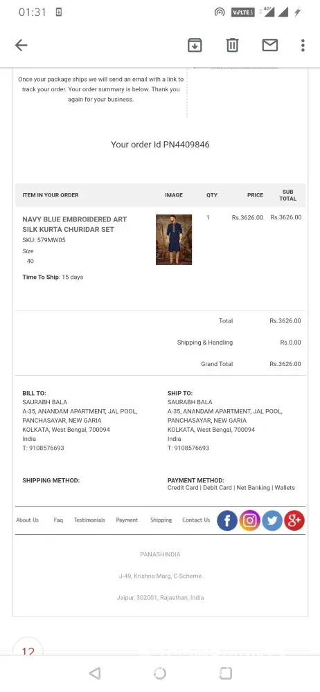 I recently made a purchase from Panash, an online clothing store, and unfortunately, my experience was not a positive one. I ordered a blue cotton dress for around 1500/- and it took 10 days to arrive, with me having to pay for the courier charges.