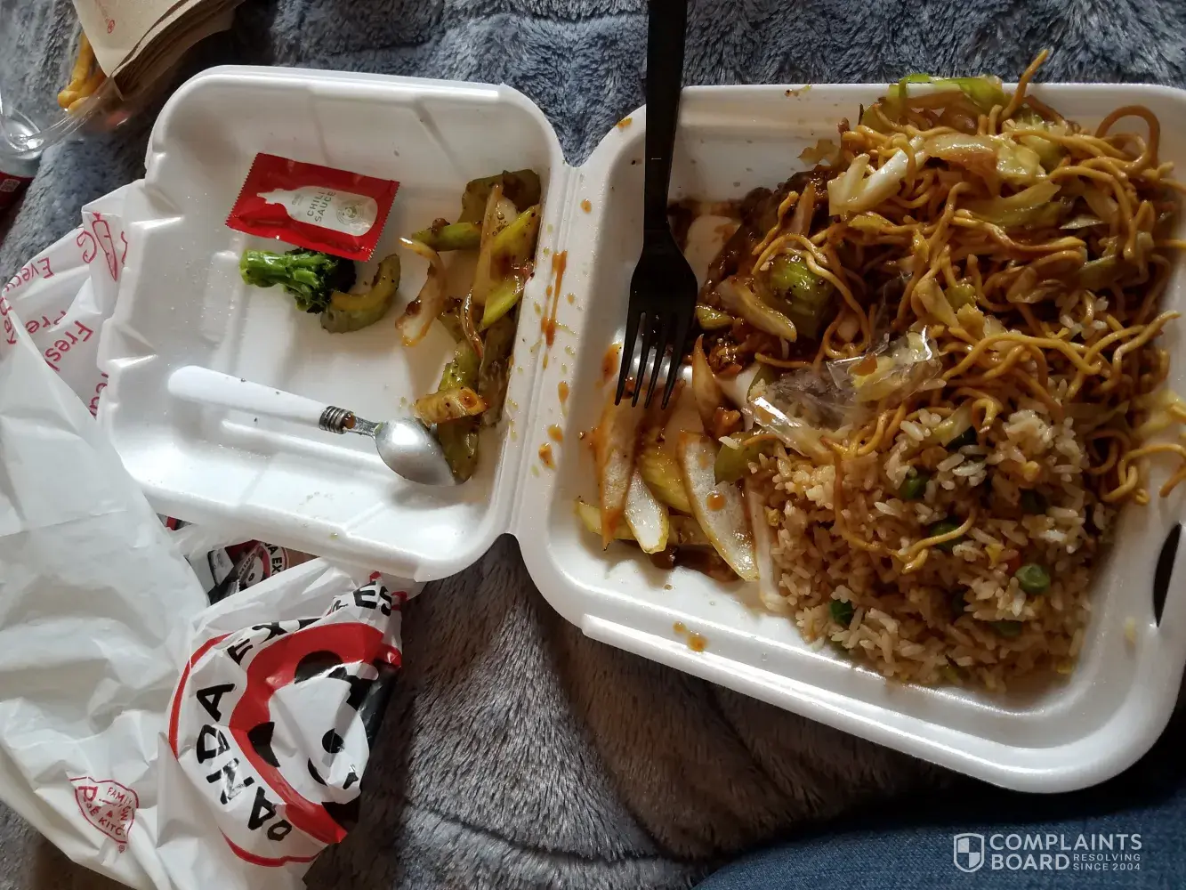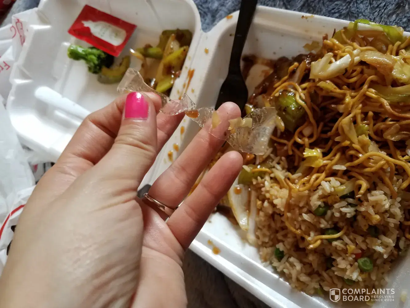As I was eating my meal and then I found a long piece of plastic bag in my chowmein. It just makes me feel how unsanitary everything is. After seeing the plastic in my meals I just threw it out. Please talk to you employee about the importance of cleaningness. If this continues you will loose customers. Oh and I also asked the drive thru lady for a spoon and she said they don't carry spoons at the moment.