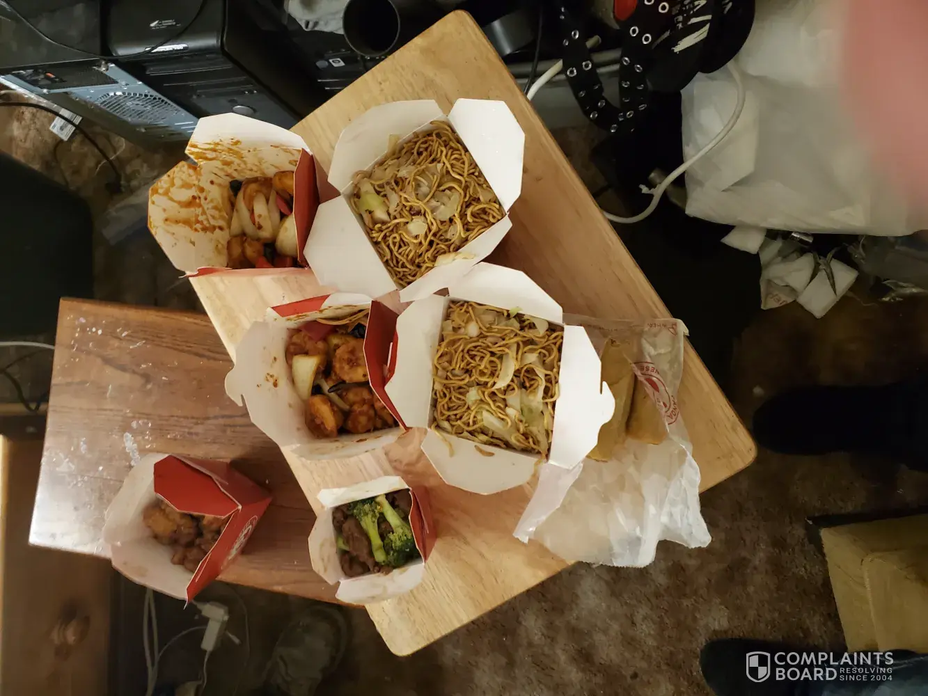 Our order was delivered with 4 of the food containers wide open in the bag. Ordered: 2 chow main, 1 large firecracker shrimp, 1 large orange chicken, 1 large veggie roll and a small brocolli beef. Got: 2 chow main, 2 large shrimp (1 box the shrimp was gross GOOEY like snot ), 1 small brocolli beef and four TINY and SOGGY egg rolls. ALL COLD. Also...I found a HAIR in the shrimp! YUCK!