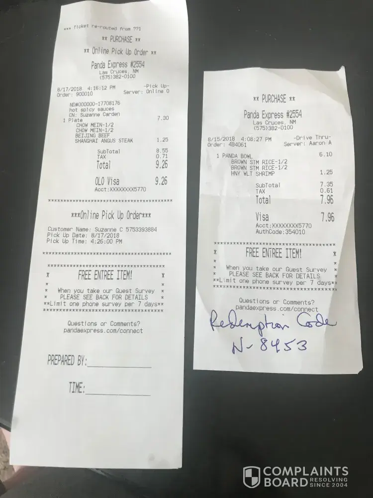 Panda Express Corporate Office / Customer Care Center apologized profusely for my inconvenience/dissatisfaction and refunded my online transaction, which was about $9.50 or so... so I guess we are even. I will return and just be sure to return if there is a problem or ask for management.