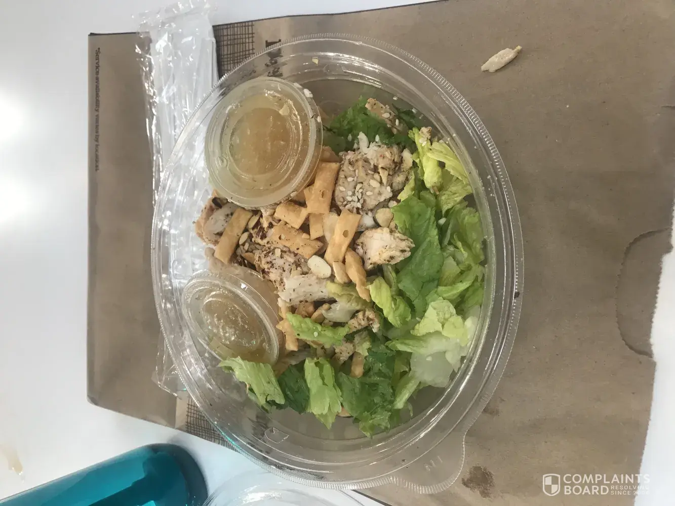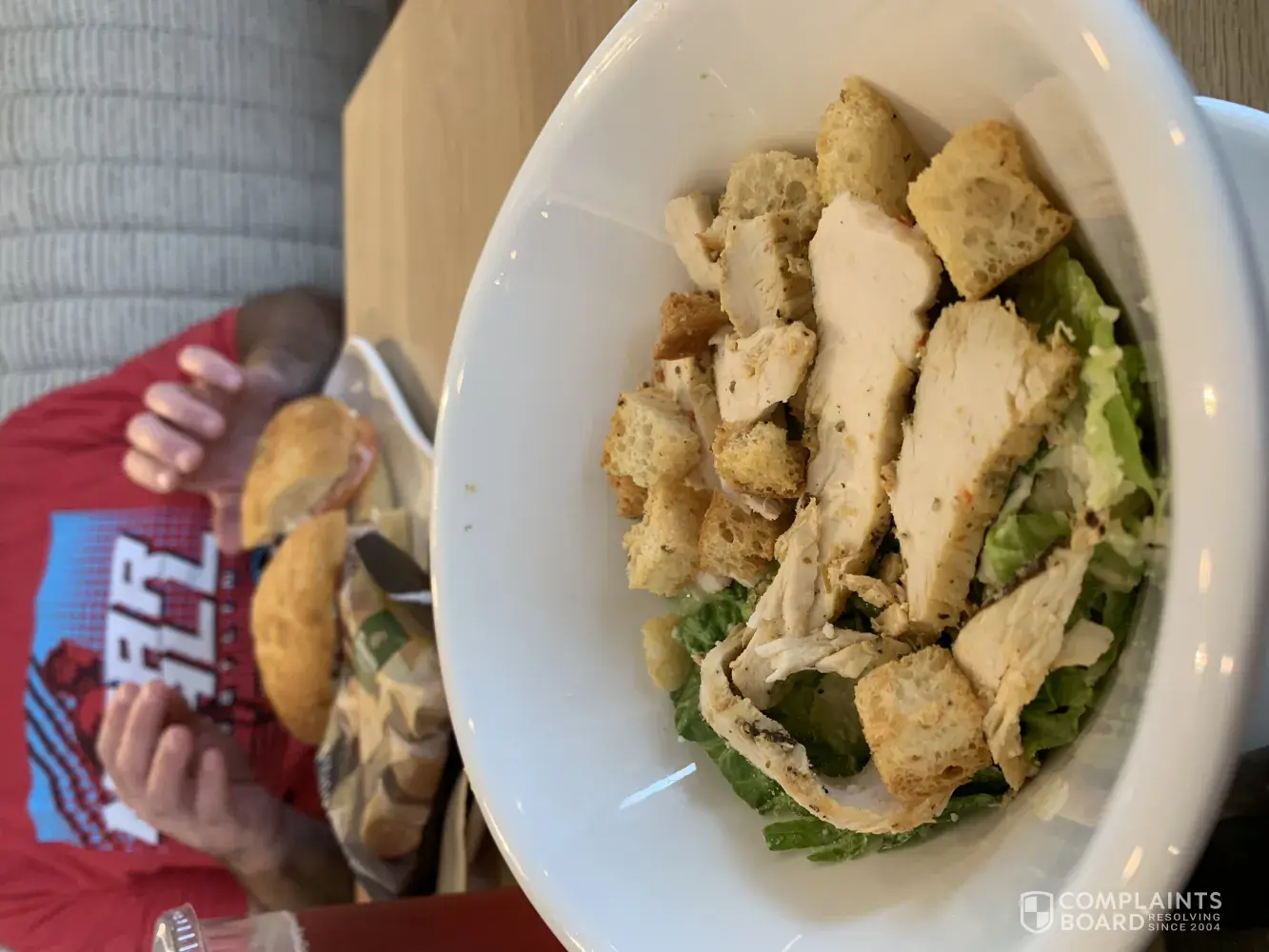 I go to Panera bread at least once a week sometimes two times. I went in today and there was no one at the counter and so I used the kiosk and there were no beepers. I had to go get one myself. I ordered a Caesar salad and literally got half a bowl. I have a picture. I also put in for baguette and did not get it. The prices are the same but to receive half a bowl was really upsetting.