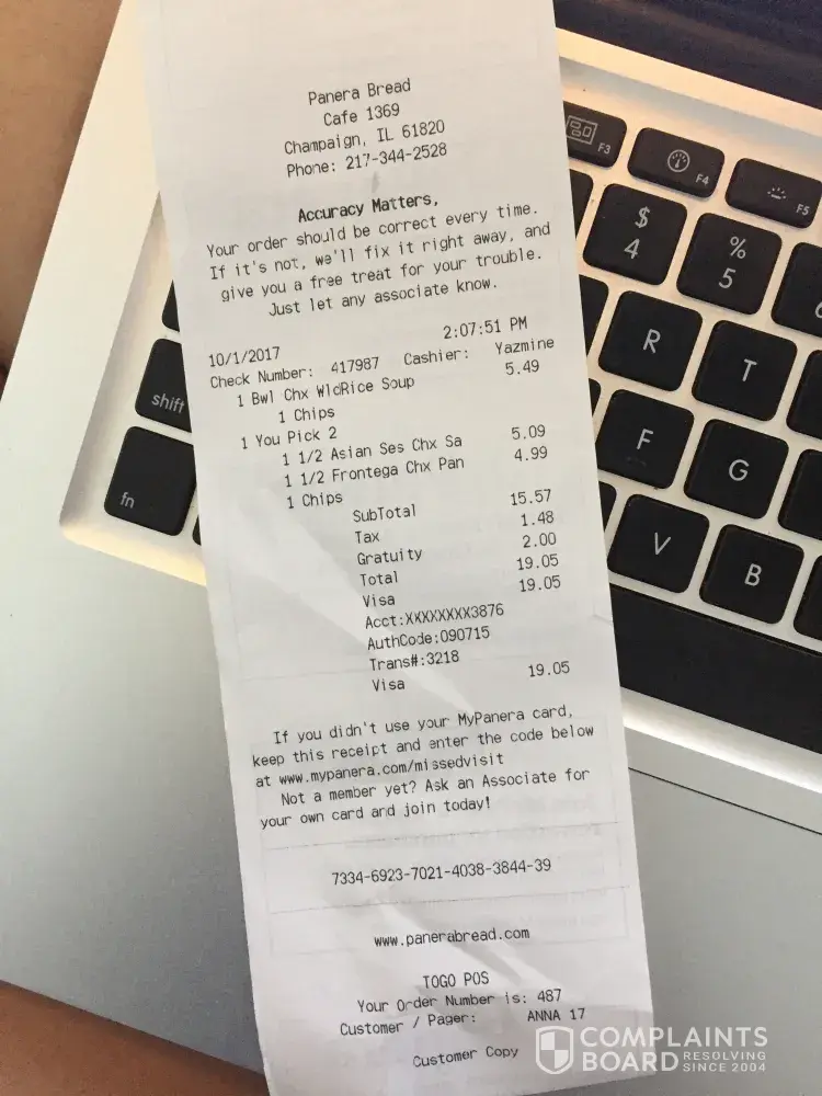 I visited the Panera at the Green St. location in Champaign, Illinois on October 1, 2017. My check number is 417987. I ordered my food to-go. Upon receiving my order, the employees forgot to include my bowl of Chicken Wild Rice soup as well as my side of chips that went with it. When mentioned, I received my soup but no side. When I went home to eat my food, there was a hair in my Asian Sesame with Chicken salad. I am extremely disappointed especially because I tipped the team, expecting great service and a correct order. Now I cannot eat the salad and am missing a part of my order. To resolve this issue, I would like a refund.
