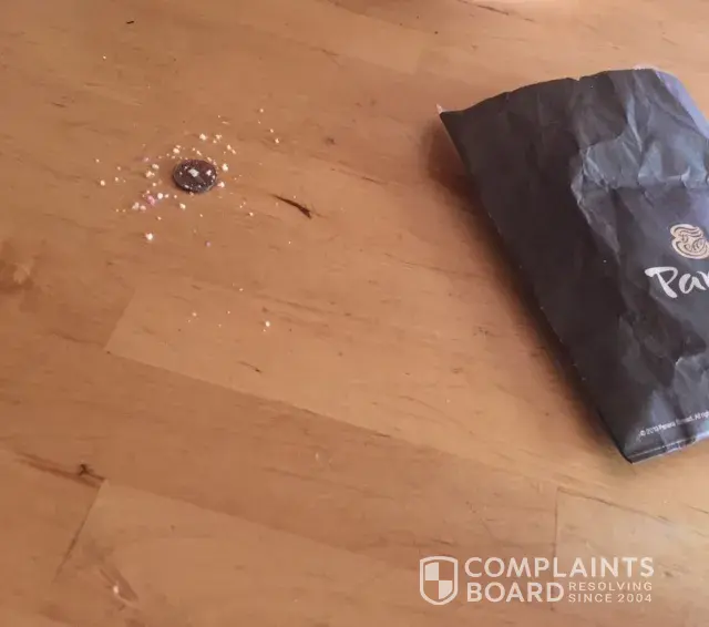 She found a penny inside of the cookie when she ate it the next day (pictured in the image below) she found a penny in the cookie. She thankfully did not eat it, as she broke the cookie and spotted it before she could, but if she hadn't spotted the penny, what if she ate it and choked on it? This penny was very filthy and could have caused damaging health conditions if ingested.