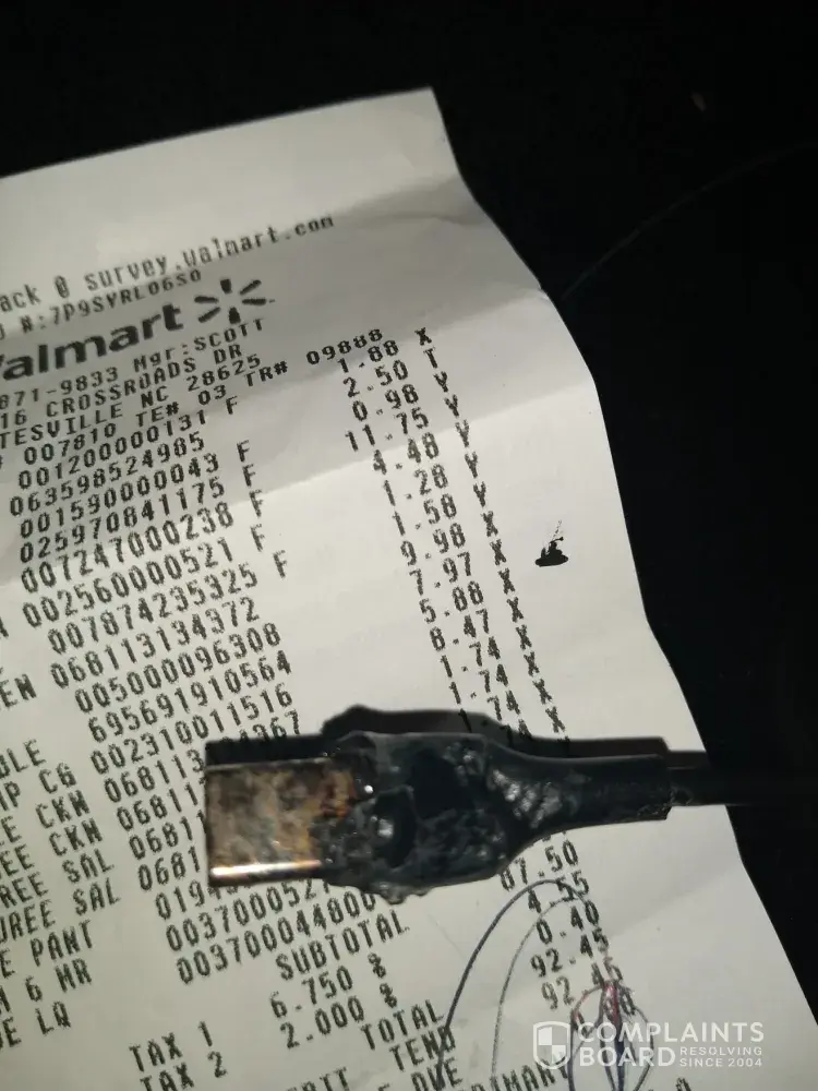 I returned the cable to Walmart for a refund and advised that we were seeking further funds to cover the damages to my wife's car!