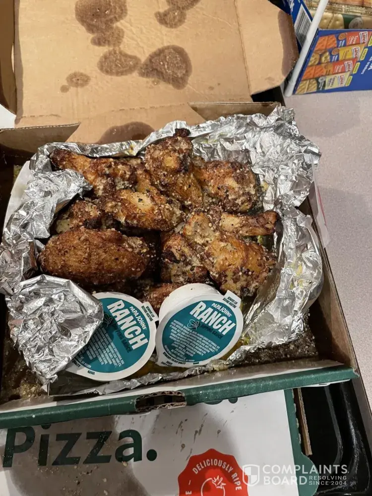 First time ordering from Papa John’s. Very disappointed in food to say the least. Wings literally were absolutely disgusting, greasy and the flavor was on the boxes (both wings &’pizza) Tiny wings, where was the meat? Seriously! Pizza was ok, but Cold not hot. Wings literally husband ate 3 I ate 1 and the rest went in the trash! Very very disappointed...